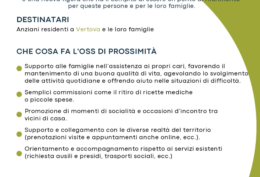 L’O.S.S. di prossimità è un’operatrice socio-sanitaria esperta nel lavoro con anziani e persone che vivono situazioni fragili; è una nuova figura che ha il compito di essere un punto di riferimento per queste persone e per le loro famiglie.