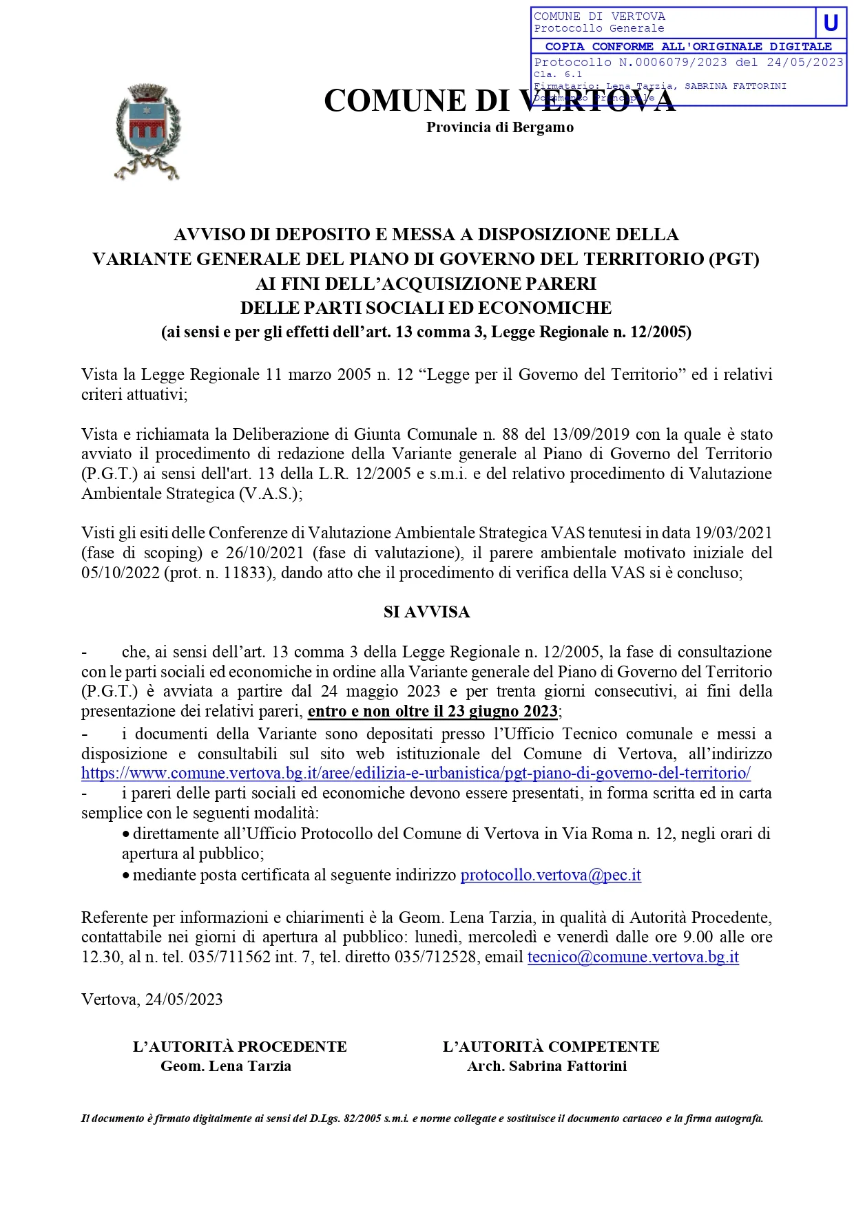In allegato Avviso di deposito e messa a disposizione della variante generale del Piano di Governo del Territorio (PGT) ai fini dell’acquisizione pareri delle parti sociali ed economiche