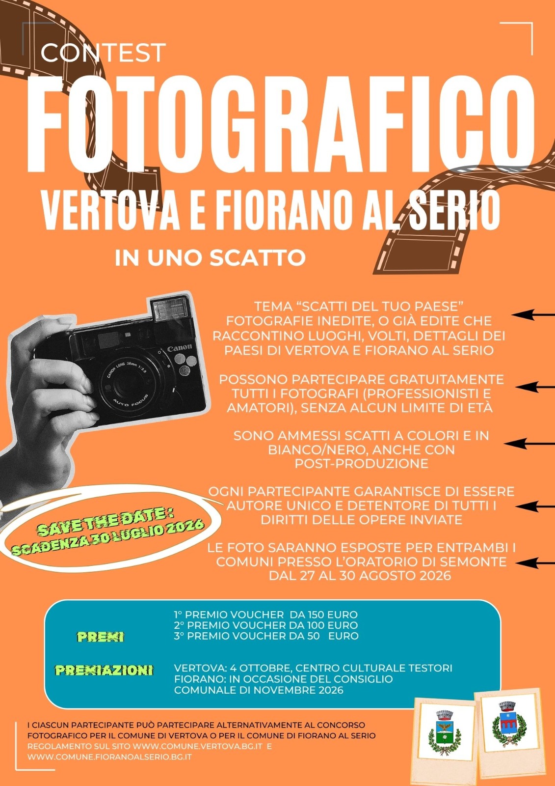 Premi: Ai primi tre classificati di ciascun territorio verranno riconosciuti voucher rispettivamente di 150 €, 100 € e 50 €. Inoltre, 12 fotografie faranno parte del Calendario ufficiale 2027 dei Comuni.